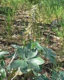 Lupinus sericatus is a species of lupine known by the common name Cobb Mountain lupine. It is endemic to the North Coast Ranges of California north of the San Francisco Bay Area, where it grows in the forest, woodlands, and chaparral of the slopes and canyons. It easily colonizes disturbed habitat as well. This is a perennial herb growing up to half a meter tall. Each palmate leaf is made up of 4 to 7 distinctive wide spoon-shaped leaflets each 3 to 5 centimeters long. The inflorescence is a raceme of several whorls of purple flowers, each flower between 1 and 2 centimeters long. The fruit is a hairy legume pod 2 or 3 centimeters long.
