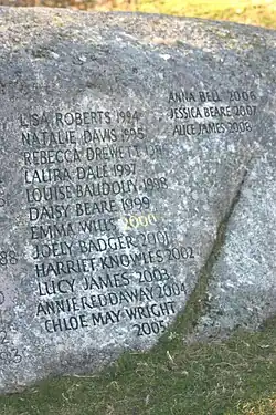 Following the post-war revival, the event moved to the Town Orchard in the village centre, where a new rock was carved, and all May Queens from 1954 to present are engraved upon it.[3][13]
