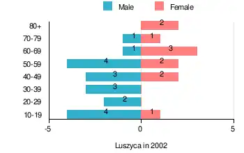 According to the 2002 Poland census, there were 29 people residing in Luszyca village, of whom 62.1% were male and 37.9% were female. In the village, the population was spread out with 10.3% under the age of 18, 31% from 18 to 44, 34.5% from 45 to 64, and 24.1% who were 65 years of age or older.[1]