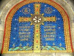 The tympanum above the main entrance is a mosaic of the cross, which features two key lines of Martin Luther's hymn "Ein feste Burg ist unser Gott" ("A Mighty Fortress is Our God"), the first line and "Das Wort sie sollen lassen stahn" (The word they still shall let remain). On the cross is the Chi rho and it is flanked by the alpha and omega, symbolising Jesus Christ as the beginning and end of the world and all creation (cf. Revelation 22.13).[1]
