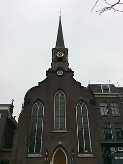 The Lutherse Kerk, also known as St. George's Chapel, is an 18th-century church in the Dutch city of Delft. The church's foundation was laid in the 15th or 16th centuries, with a wooden structure being built on top of it. This first wooden church burned down in 1536, and the city of Delft erected an armory where the church had stood. The armory was converted into the current Lutheran church in 1768, and a new stone facade and steeples where added to the existing building.[1][2]