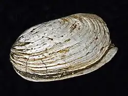 Members of this genus have large, elongated oval shells with two equal sized valves. The anterior end is somewhat sharply curved but the posterior end is more rounded. The valves gape slightly at both ends, more so at the posterior end. The shell is fairly thick and is sculptured with fine concentric lines corresponding to periods of growth. The basic colour is white and the periostracum is brown, but the latter is usually abraded. The interior surface of the valves is glossy white. The beaks are blunt and situated slightly closer to the anterior end. The ligament is small and largely internal. The foot is small and the siphons are long and are housed in a common horny sheath for most of their length.[2]
