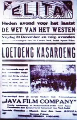 It was first brought to the public in 1921 by Bandung regent RA Wiranatakusumah in the form of gending karesmen; a drama using traditional music. Five years later, NV Java Film Company produced a silent film, titled Loetoeng Kasaroeng, the first ever movie in the country.[2] It was made during the Dutch colonial era, under the direction of L. Heuveldorp.[10] It was filmed in Bandung in 1926 and released there by the NV Java Film Company.[11] It played from 31 December 1926 to 6 January 1927 at the Elite and Oriental Bioscoop (Majestic) theatres.[12]