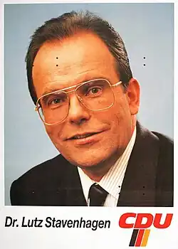Lutz-Georg Stavenhagen (6 May 1940 in Jena – 31 May 1992 in Pforzheim) was a German politician and member of the Christian Democratic Union of Germany (CDU). He was Minister of State in the Foreign Office from 1985 to 1987 and Minister of State in the Federal Chancellery from 1987 to 1991.