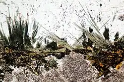 Luxullianite (also known as luxulyanite or luxulianite) is a rare type of porphyritic tournalinized granite, notable for the presence of clusters of radially-arranged acicular tourmaline crystals enclosed by phenocrysts of orthoclase and quartz in a matrix of quartz, tourmaline, alkali feldspar, brown mica, and cassiterite.