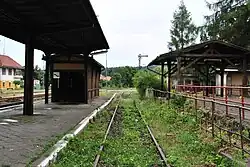 The railway station, dating back to 1885,[7] is located on the western side of the station, at 1 Dworcowa Street.[18] The station building is two-story and masonry, currently serving mainly residential purposes. Attached to the station is a warehouse with a loading ramp. The entire complex has undergone renovations in the past. Originally, the station had a wooden-masonry extension with a veranda (on the southern side) and additional warehouses (on the northern side).[7]