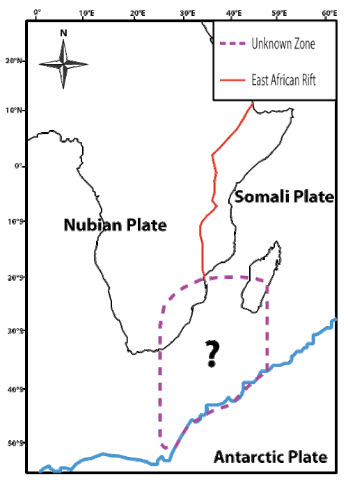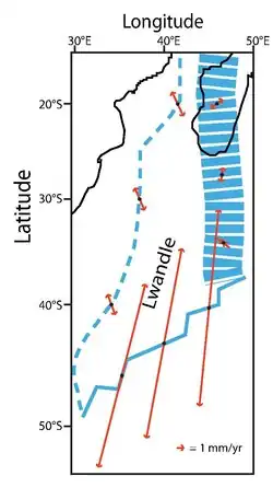 - Western boundary – The western boundary is especially poorly understood; there is very little seismic activity along this boundary.[10] Despite that, a misfit to a seafloor magnetic anomaly strongly suggests that motion exists.[3][17] Some models suggest it is a right-lateral strike slip boundary with a rate of about 1 mm/yr, with some extension.[5] Still, others even suggest that motion ceased at this boundary approximately 11 million years ago.[3][18] This boundary separates Lwandle from the Nubian plate.[3]