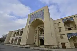 The madrasa is the oldest building of the ensemble. It has 160 cells, located in two stores on the perimeter of a two iwans yard. The traditional facades of the madrasah are adorned with majolica.[2] Over its history, the madrasa performed many different roles: it served as a caravanserai and defensive fortress, and even as a place of execution. Today a section of the madrasa is a museum dedicated to the writers Sadriddin Ayni and Jalol Ikromiy.[3]