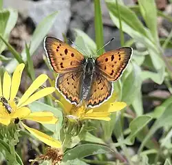 Lycaena rubidus, the ruddy copper, is a butterfly of the family Lycaenidae. It is found in the western mountains of North America.[3] Adults lay their eggs on plants of the genus Rumex, which later become the larval food plants. This butterfly gets its name from the brightly colored wings of the males, which are important in sexual selection.[4] Its larvae exhibit mutualism with red ants, and are often raised in ant nests until they reach adulthood.[5] Adults are on wing from mid-July to early August.[3]