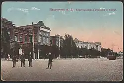 A female gymnasium was founded in Nakhichevan-on-Don in the late 19th century. It was named Ekaterininskaya in honour of Empress Catherine the Great, the city's founder. The building of gymnasium was designed in 1892 by Nakhichevan architect Nikolai Durbakh. Originally the building had two floors. Ekaterininskaya female gymnasium was an elite educational institution, teaching divine law, French, Russian, geography, history, handicrafts, and art. The original period of study was eight years; in 1910 it was increased to nine years.[3] In 1921 the S. D. Markov First Soviet Labour School was opened in the building. In the 1930s it was renamed the Karl Marx School. Between 1943 and 1944, during the Second World War, the building housed a hospital, and was then used by military institutions until 1947. It was then repaired and in 1952 Lyceum № 13 was opened.[2]