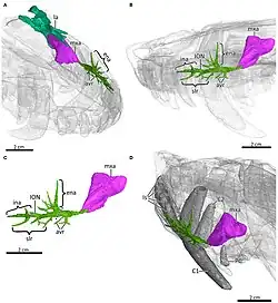 - ^ Benoit, J.; Ruf, I.; Miyamae, J. A.; Fernandez, V.; Rodrigues, P. G.; Rubidge, B. S. (2020). "The Evolution of the Maxillary Canal in Probainognathia (Cynodontia, Synapsida): Reassessment of the Homology of the Infraorbital Foramen in Mammalian Ancestors". Journal of Mammalian Evolution. 27 (3): 329–348. doi:10.1007/s10914-019-09467-8.