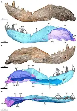 - ^ Olroyd, S. L.; Sidor, C. A. (2022). "Nomenclature, comparative anatomy, and evolution of the reflected lamina of the angular in non-mammalian synapsids". Journal of Vertebrate Paleontology. 42 (1). doi:10.1080/02724634.2022.2101923.