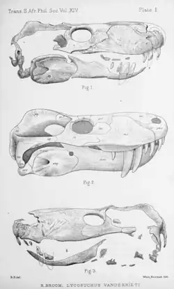 - ^ a b c d e f Broom, R. (1903). "On an almost perfect skull of a new primitive theriodont (Lycosuchus vanderrieti)". Transactions of the South African Philosophical Society. 14 (1): 197–205.