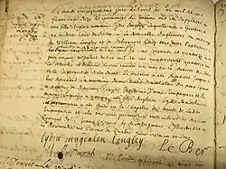 Longley lived in the Notre Dame community for 62 years, mainly in Montreal. Later she lived in Sainte-Famille, Île d’Orléans, near the city of Quebec, where she was appointed as the superior of the mission.[1] Late in life she wrote to her brother John Longley, who by then had been ransomed from the Abenaki and returned to Groton, against his wishes. She encouraged him to abjure his "heretical" Puritan faith and join her in following Roman Catholic ways.[2]