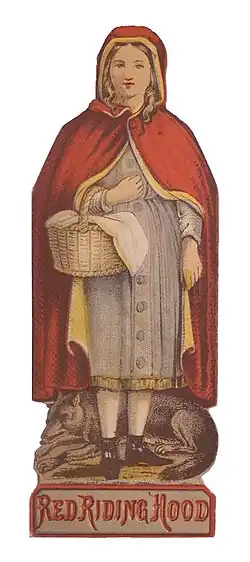 In 1863 she wrote and designed Red Riding Hood, a verse version of the folk tale "Little Red Riding Hood" that was die-cut into the outline shape of the little girl with the wolf crouching by her feet.[3][5] Published by L. Prang & Co., it was the first book in the United States to be shaped like a person or an animal.[1][5][6][7] Prang followed up with more shaped books (also known as 'Doll books') written by Very, including Goody Two Shoes and a verse version of Daniel Defoe's Robinson Crusoe.[6] Very claimed the shaped-book design was hers and tried but failed to get a patent; her claim was disputed by Prang, which countered that it had originated the shaped books.[5][6] In any case, the shaped books were quickly imitated by other publishers, and Very later wrote that she was paid very little for these books, which were quite successful.[5]