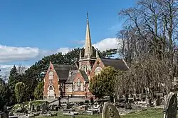 The Lye and Wollescote Cemetery Chapels building in the centre of the cemetery (originally called the Mortuary Chapels) was built in 1879 and is a Grade II listed building.[2][3] It had two chapels, at opposite ends of the building; the nonconformist chapel was closed in the 1970s and the Church of England chapel closed following a fire in 1993.[4] The West Midlands Historic Buildings Trust received a grant from the Heritage Lottery Fund to take full ownership of the building in March 2014. The trust planned to conserve the chapels and to bring them back into use as a venue for civil ceremonies.[5][6] This project also aimed to create resources to encourage people to discover more about their local heritage and nature conservation, in particular via a resource-pack for schools and a nature trail.[7] The refurbishment was completed in early 2016, the building is now in use as a secular registration office and has been renamed as the Thomas Robinson Building.[8][9]