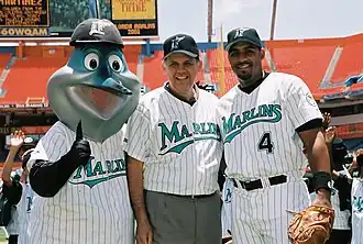 ![]() Mouton (right) with Billy the Marlin and Mel Martínez in 2001 | |