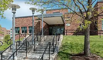 The building is a quonset-shaped structure covered with multi-colored (orange, tan, black, and brown) brick wall cladding set in a common bond pattern. Projecting from the facade of the structure is a one-story rectangular wing flanked on either side by two vertical appendages, which have multi-paned colored glass windows. The one-story wing has a strip of casement windows. The stairway is situated on the west side of the building. A white concrete block structure with wall buttresses connects Lynah Rink to Bartels Hall.[2] It was constructed for $500,000 with a donation from Walter S. Carpenter Jr., chairman and former president of DuPont (and Cornell class of 1910)[3] whose gift came with the stipulation that he did not want his name on the building. The facility was designed by Van Storch, Evans, and Burkavage of Waverly, PA and constructed by Streeter Associates of Elmira, NY.[4]