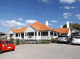 The roof is steeply pitched and composed of two large hips that are symmetrically arranged around a central axis through the front elevation and are clad in terracotta Marseilles pattern tiles. Twin gables, of a uniform roof pitch, project from the building's front elevation. The pediments of the gables are clad with fibrous cement sheeting and are decorated with wide timber battens. Two tall rendered chimneys with concrete caps are the only other visible elements on the vast roof. Part of the verandah roof on the eastern side of the house has been replaced with corrugated iron.[1]