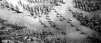 - ^ King Charles would send two more fleets to relieve the Siege of La Rochelle. William Fielding, Earl of Dengbigh, sailed for La Rochelle in April 1628 but returned without a fight claiming that had no commission that authorized him to participate in fighting. The Duke of Buckingham organized the next fleet which sailed under the Earl of Lindsey who was now the Admiral of the Fleet. The Earl of Lindsey sailed in August, 1628 with 29 warships and 31 merchantmen and in September 1628, they attempted to relieve La Rochelle. The English bombarded the French positions and tried to force the sea wall, all in vain. The Earl of Lindsey was forced to withdraw and return to England. La Rochelle surrendered to King Louis XIII on 28 October 1628 and Catholicism in France solidified. England then ended its participation in the Thirty Years War by signing a peace treaty with France in 1629, and with Spain in 1639.