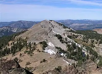 Lyon Peak is located in the Granite Chief Wilderness on land managed by Tahoe National Forest. It is situated two miles west of the crest of the Sierra Nevada mountain range, with precipitation runoff from the peak draining north into headwaters of North Fork American River, and south into headwaters of Middle Fork American River. Topographic relief is modest as the summit rises 2,900 feet (880 meters) above the Middle Fork in 1.5 mile. Neighbors include Tinker Knob 3.1 miles (5.0 km) to the north-northeast, Granite Chief 1.6 miles (2.6 km) to the east-southeast, and line parent Needle Peak is 0.9 miles (1.4 km) east-southeast. The Palisades Tahoe ski area is four miles east of Lyon Peak. This landform's toponym has been officially adopted by the U.S. Board on Geographic Names,[4] and has appeared in publications since at least 1915.[5]