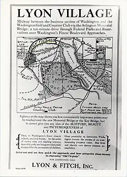 Advertising for Lyon Village emphasized its proximity to planned infrastructure like the Arlington Memorial Bridge and easy commutes into Washington by car as well as trolley.[9] This reflected the broader movement towards car-based transit and away from the trains and trolley lines that had served as the dominant forms of transportation in Arlington.[9] Also highlighted in Lyon Village's promotional materials was its racial segregation that only permitted white buyers to purchase property.[10] Racially restrictive covenants, which are known to have existed in Lyon Village and were common in Jim Crow era Arlington County, prevented African Americans and other minority groups from owning homes.[10][11]
