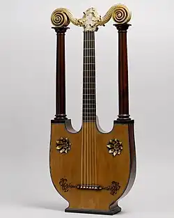 A musical instrument of the chordophone family, the lyre-guitar was a type of guitar shaped to look like a lyre, popular as a fad-instrument in the late 1800s. It had six single courses, with a fretboard located between two curved arms recalling the shape of the ancient Greek kithara. It was tuned and played like the conventional guitar.