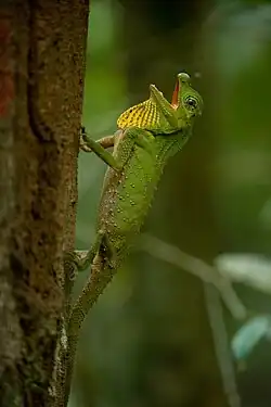 - ^ a b Wickramasinghe, L.J.M., Kannishka, S., Pushpamal, V., Vidanapathirana, D., Jayasekara, D., de Alwis Goonatilake, S., Sivaruban, A. & Gabadage, D. (2021). "Lyriocephalus scutatus". IUCN Red List of Threatened Species. 2021: e.T170409A123298967. Retrieved 13 November 2021.