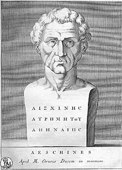 Aeschines of Sphettus (Ancient Greek: Αἰσχίνης Σφήττιος, c. 425 BC – c. 350 BC) or Aeschines Socraticus (Ancient Greek: Αἰσχίνης Σωκρατικός), son of Lysanias, of the deme Sphettus of Athens, was a philosopher who in his youth was a follower of Socrates.[1] Historians call him Aeschines Socraticus—"the Socratic Aeschines"—to distinguish him from the more historically influential Athenian orator also named Aeschines. His name is sometimes but now rarely written as Aischines or Æschines.
