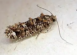 Male, female. — 24-29 mm. Head and palpi whitish-ochreous mixed with dark fuscous. Antenna? whitish-ochreous, spotted above with dark fuscous. Thorax dark fuscous irrorated with whitish-ochreous, posterior margin sometimes whitish-ochreous. Abdomen whitish-ochreous irrorated with grey. Legs dark fuscous, suffusedly ringed with whitish-ochreous, posterior tibiae whitish- ochreous. Forewings elongate, costa moderately arched, apex obtuse, hindmargin very obliquely rounded; whitish-ochreous, irregularly suffused with fuscous, and more or less strongly coarsely irrorated with blackish; a large tuft of scalesvery near base, a small one near inner margin at 1⁄4, a third on fold opposite middle of inner margin, and a fourth above anal angle; the blackish irroration tends to form two triangular blotches, of which apex touches inner margin at 1⁄3 and 2⁄3; an ill-defined roundish ochreous-whitish ante-apical spot, preceded by a blackish-fuscous suffusion margining it : cilia fuscous, towards base irrorated with dark fuscous and very obscurely spotted with ochreous-whitish. Hindwings whitish-fuscous; cilia fuscous-whitish, with a faint darker line.[3]