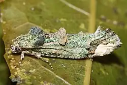 Hudson regarded the adult moth's protective resemblance to a moss or lichen covered twig as highly efficient in protecting the insect from predation.[7]