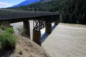 The Lytton CNR Fraser Bridge is a deck truss bridge carrying the Canadian National Railway tracks across the Fraser River at Lytton, British Columbia. It is of a similar design to the Lytton CNR Thompson Bridge, located approximately 1.4 kilometers (0.87 mi) north. The bridge consists of three deck Pratt truss spans; the centre span measures approximately 90 metres, and each side span measures approximately 45 metres. The approach at either end is a pair of deck plate girder spans of approximately 20m each. The three centre truss spans are supported on four concrete piers. At each end, the approach girder spans are supported on the abutments, a taller and thinner concrete pier, and the truss spans. The Fraser River's water level varies dramatically throughout the year; the centre piers can be fully surrounded by rushing water in the spring[1] and completely on dry land in late summer and fall.[2] A pedestrian walkway on the north side of the bridge serves Indian reserve communities and other rural residents on the west side of the Fraser River.