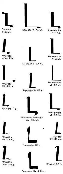 Lyun, or Liwn (majuscule: Լ; minuscule: լ; Armenian: լյուն; Classical Armenian: լիւն) is the twelfth letter of the Armenian alphabet. It represents the voiced alveolar lateral approximant /l/. It is typically romanized with the letter L.[1] Created by Mesrop Mashtots, it has a numerical value of 30.[2]