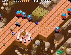 The player must take control of Alice, as she makes her way through nine isometric stages. Alice is able to blow bubbles at enemies to knock them off the platforms and she can collect various powerups along the way. Holding the fire button down generates bigger bubbles, but if it is held down for too long, it will burst and she will start blowing a new one. The enemies retaliate by shooting marbles at her (which can cause her to fall over the edge of the platforms unless they are avoided or jumped over).[2] The seventh, eighth and ninth stages are palette-swapped versions of the second, fourth and first ones respectively, but they feature different enemy types and bosses.
