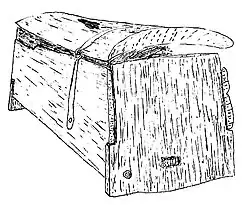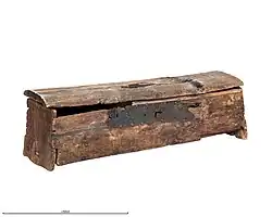 The chest, 90 cm (35 in) long, 26 cm (10 in) wide and 24 cm (9.4 in) high, was made of oak with iron hinges and lock.[3] It was intact despite the rough encounter with the plough. It was rectangular with a slightly curved lid and flat bottom. The bottom was joined to the ends via a mortise and through tenon. Pegs were used to attach the sides to the bottom and end pieces. The ends and sides were trapezoidal and slightly angled.[7] A lock wrought from iron was attached to the front side of the chest.[5]