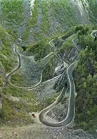 The first road through the Måbødalen valley was built from 1900 to 1916. Consisting of three tunnels and three bridges, including the Måbø Bridge, it is characterized by its many hairpin turns. The road is widely used by pedestrians and cyclists today and it is regarded as a good example of early 20th century road engineering. This was the first road connection between Eastern and Western Norway over the Hardangervidda plateau when it was finally completed in 1928. A new road through Måbødalen was opened in 1986, and it replaced the old road (which was not removed). The new road is wider and has many more tunnels to replace the narrow, old road and all its hairpin turns. The Måbødalen bus accident occurred in 1988 on the new road.