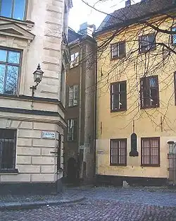 Mårten Trotzigs gränd (Swedish: "Alley of Mårten Trotzig") is an alley in Gamla stan, the old town of Stockholm, Sweden. Leading from Västerlånggatan and Järntorget up to Prästgatan and Tyska Stallplan, the width of its 37 steps tapers down to a mere 90 centimetres (35 in), making the alley the narrowest street in Stockholm.