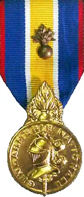 The Médaille de la Gendarmerie nationale (English: Medal of the National Gendarmerie or Federal Police) is a French military decoration created on 5 September 1949 on proposition of the then Minister of Defence, mister Paul Ramadier.[2] It was originally created in a single grade for award to officiers and NCOs of the Gendarmerie nationale who were cited in the orders of the entire service. Such a citation in the orders of the entire service, and all potential subsequent ones would be denoted by a grenade device on the ribbon as the medal could, and can still only be awarded once to any potential recipient.[2][3] The medal could also be exceptionally awarded to persons not members of the service for important services rendered to the gendarmerie or for help during special missions. These presentations were made without a citation and thus without any ribbon device.[2]