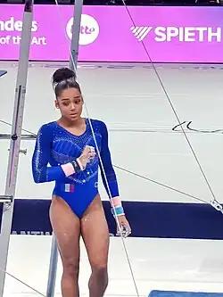 In June, de Jesus dos Santos won her third consecutive French all-around title, and she won the uneven bars and floor exercise titles.[41] On 3 September, she was named to the team to compete at the World Championships in Stuttgart, Germany alongside Lorette Charpy, Marine Boyer, Coline Devillard, and Aline Friess.[42] Later that month she competed at the Paris Challenge Cup where she won gold on uneven bars and placed seventh on balance beam.[43] Then during the qualification round at the World Championships, she led the French team to qualify to the team final in fourth place behind the United States, China, and Russia. Individually, she qualified to the all-around final in third place behind Simone Biles and Sunisa Lee of the United States, the balance beam final in sixth place, and the floor exercise final in fifth place.[44] In the team final, de Jesus dos Santos contributed an all-around score of 55.498 to help France finish in fifth place.[45] This result qualified France for a team spot at the 2020 Olympic Games.[46] In the all-around final, she fell off the uneven bars twice and finished all the way down in twentieth place.[47] In event finals, she still finished off the podium, placing fifth on beam and fifth again on floor. She was awarded the Longines Prize for Elegance alongside American Sam Mikulak.[48]