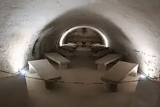 The cenotaphs in the crypt are arranged in an arc and covered with the tricolor, surrounding the urn containing the ashes of unknown deportees.