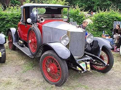 For 1908 the car range included the 60/80 and the 40-hp, which was a smaller version of the 60/80, the 2-cylinder cars being finally dropped, the last of them a 12/14.[9] They were replaced in 1909 by a 12/14 four-cylinder (built in Germany by Bergmann Elektrizitäwerke of Berlin),[10] joined by a 5-litre 26 hp (19 kW), and in 1911 all cars got 4-speed gearboxes. Bodywork was made by Vanden Plas. The Bergmann-built cars proved expensive in Britain, thanks to tariffs.[11]