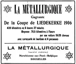 The first cars were 4.5 hp (3.4 kW) 2-cylinder models with chain drive. In 1900, the company switched to shaft drive.[1] In 1905 an all-new range was introduced, resembling contemporary Daimlers, both designed by Ernst Lehmann, who come to Métallurgique from there in 1903.[2] These cars, with pressed-steel chassis, live rear axle, shaft drive,[3] high-tension ignition,[4] and the option of dynamo-powered[5] electric lighting, were to establish the company as one of the finest makers of sporting cars in Europe. Production was targeted for export, and most sales were in Britain.[6] In 1906, there came the 4-cylinder inlet over exhaust 10 L (610 cu in), with a claimed output of 100 bhp (75 kW) at 1400 rpm, enabling the car to reach 160 km/h (99 mph).[7] The cars got a distinctive V front radiator in 1907.[8]
