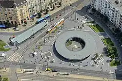 The main feature of the intersection is the Gomba, or Mushroom. This building, constructed in 1942 in the middle of the roundabout, featured shops as well as the electrical transformer distributing current to the significant tramway network. As it was in poor condition, the mushroom was earmarked for redevelopment in line with Budapest's cultural district and construction of the M4 metro.[1] The building was fully renovated by the summer of 2014.