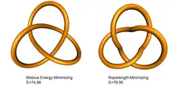 In mathematics, the Möbius energy of a knot is a particular knot energy, i.e., a functional on the space of knots. It was discovered by Jun O'Hara, who demonstrated that the energy blows up as the knot's strands get close to one another.[1] This is a useful property because it prevents self-intersection and ensures the result under gradient descent is of the same knot type.
