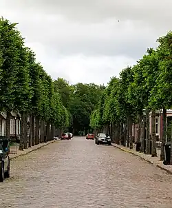 The castle connects with the old part of Møgeltønder (the houses around the medieval church) through the picturesque newer main street "Slotsgaden" with 18th-century houses, flanked with lime trees. South of the church, the town is a good example of a rural Danish town consisting of farmhouses, dating from the 18th and 19th centuries, where the farms have not been moved out to their fields as was customary all over Denmark in the period 1784-c1830 due to agricultural reforms.