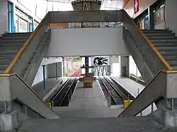 Between 1894 and the 1930s, Mürren station was linked to the Kurhaus in Mürren village by the Mürren tramway, a 500 m (1,600 ft) long, 500 mm (19+3⁄4 in) gauge, horse-drawn tramway. The passenger car for this line has been restored, and is now on display in the upper level of the station.[4]