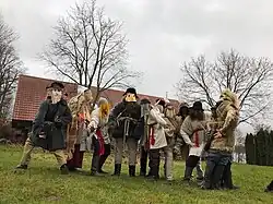 On Mārtiņi mask marches helped with Mārtiņi's healing and pedestrians with Mārtiņi's children or mārtiņiem: "On Mārtiņi Eve the youth dressed up and walked around asking for gifts, which then all together were poured." (1781)[5] "On Mārtiņi Eve the Mārtiņi children chased Mārtiņi with sticks."[6] If Children of Mārtiņi flogged someone from home team, then do not run away under the bed, because then all his life a man will be fearful."[7] "On Mārtiņi Eve, men went through the village, dressed in clipped fur coats as someone from evil side and girded with belts of braided straw, and also stuck a tail to buttocks; they went to frighten children, in order to make them learn and listen to their parents." (1852)[8]
