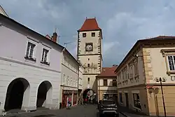 Míru Square is the historic centre of Mělník. It is lined with valuable Renaissance and Neo-Renaissance houses. The landmark of the square is the town hall with Renaissance archways, Gothic bay window of the Chapel of St. Barbara, and Baroque tower. The Church of the Fourteen Holy Helpers with the building of former Capuchin monastery are also located on the square.[3]