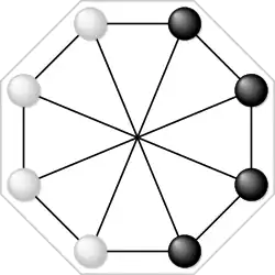 Mū tōrere is a two-player board game played mainly by Māori people from New Zealand's North Island. Each player has four counters. The game has a simple premise but expert players are able to see up to 40 moves ahead. Like many other Māori board games, it is played on a papa tākoro (game board) and is tightly interwoven with stories and histories.[1]