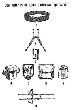 The M-1956 load-carrying equipment (LCE), also known as the individual load-carrying equipment (ILCE), was developed by the U.S. Army and first issued in the early 1960s.[1] The M-1956 LCE was designed to replace the M-1945 Combat Pack, the M-1923 cartridge belt, the M-1936 pistol belt and the M-1937 BAR magazine belt. The M-1956 LCE was designed to be quickly configured, using no tools, to accommodate various mission and ammunition loads. The M-1956 LCE remained in service through the 1980s and set the standard for future United States military load-carrying equipment.